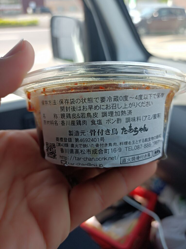 親鳥皮&若鳥皮ミックスポン酢、税込み480円 製造元 骨付き肉 たあちゃん
